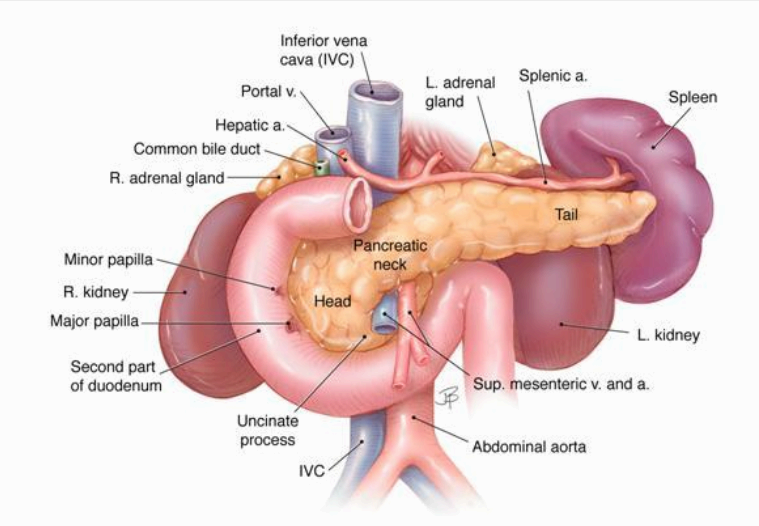 췌장은 복막 후 장기(retroperitoneal organ)로 다양한 효소를 생산하여 음식물을 소화시킨다. 췌장은 췌두부(pancreas head), 췌체부(body), 췌미부(tail)로 구분하며 췌두부에는 구상돌기(uncinate process)가 있다. 태생기에 복측(ventral pancreas)과 배 측(dorsal pancreas)으로 발생하여 췌체부는 전측(anterior)으로 췌두부와 췌미부는 후측으로 휘어져 있다.