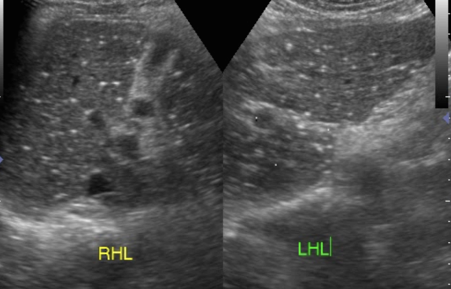 - 초음파상 진행정도에 따라 정상 간 소견에서 간경화에 가까운 소견까지 다양하다.