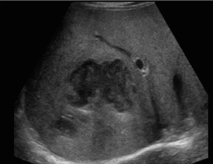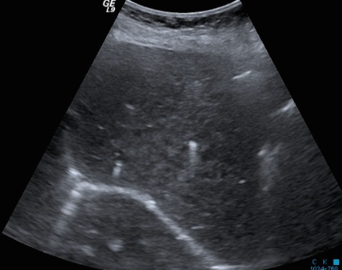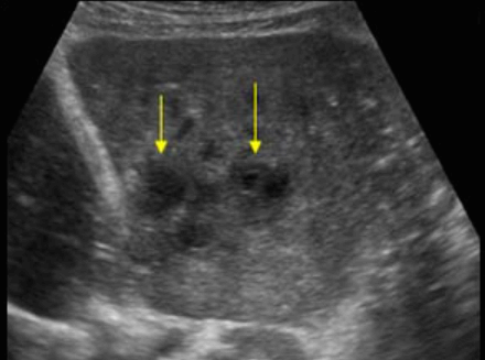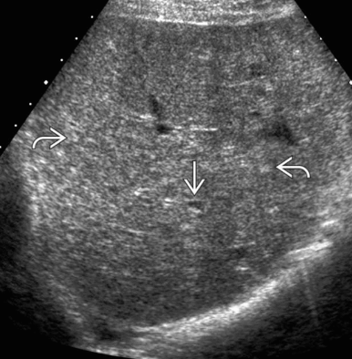 - 크기가 작고 간전체에 흩어져 보임(multiple small hyperechoic lesion)