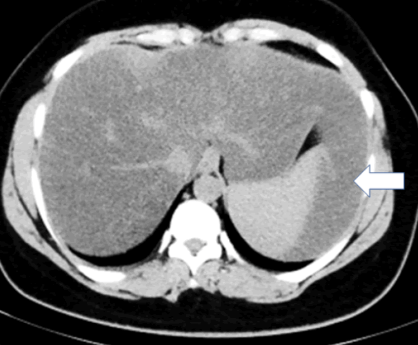 Beaver tail liver 좌엽이 길고 커져서 비장에 인접해 있다. 마치 비장의 피막하 혈종(subcapsular hematoma)처럼 보인다. 주로 마른 여자에서 확인된다.
